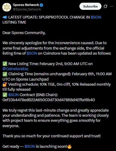 根据孢子网络X的帖子,认领时间保持不变:2月6日上午11:00 UTC(印度标准时间下午 4:30)通过官方启动平台。