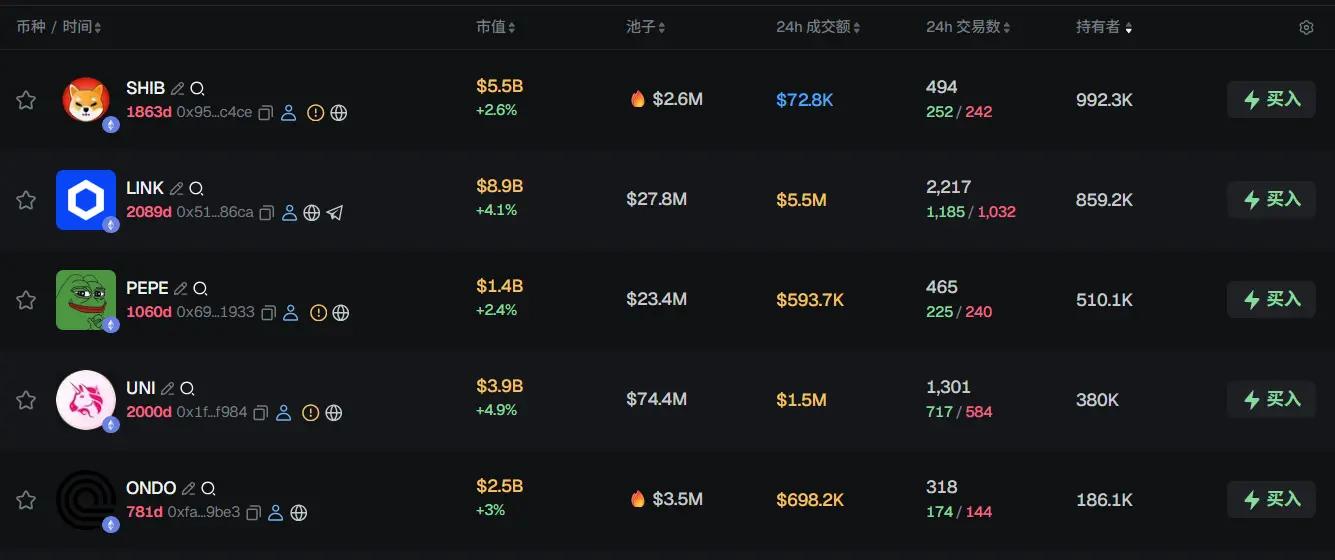 过去 24h ETH 热门代币前五依次为:SHIB、LINK、PEPE、UNI、ONDO