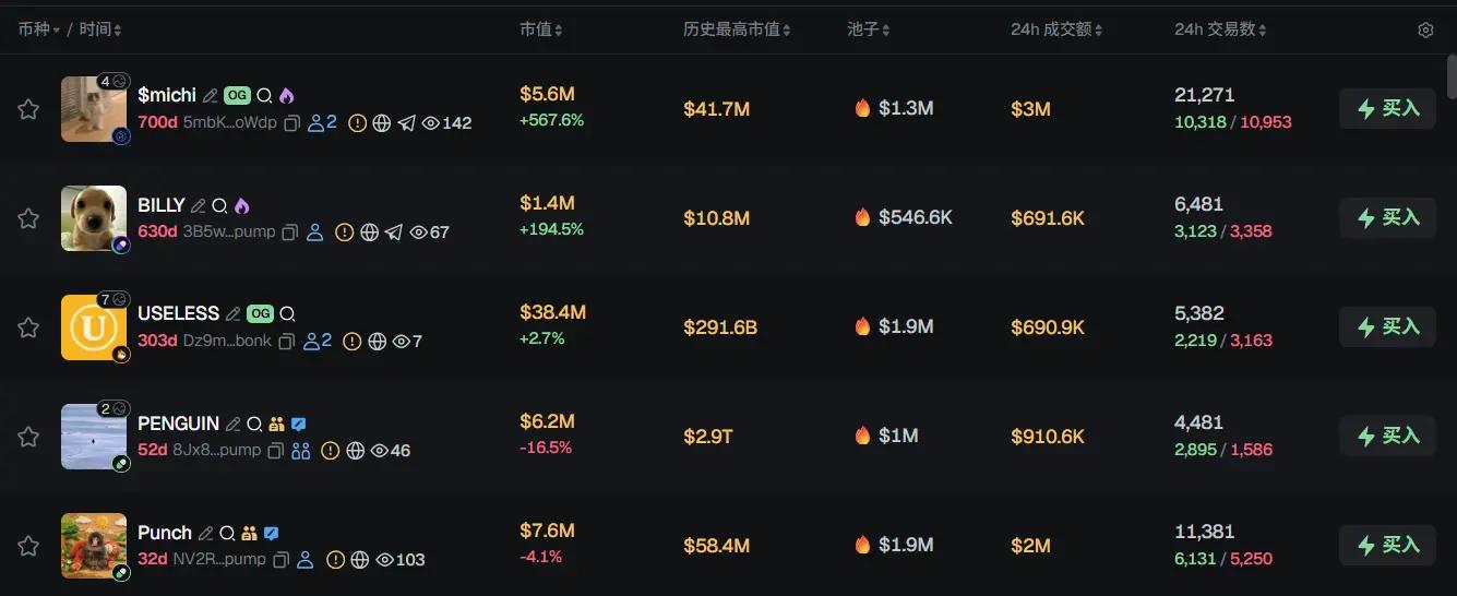 过去 24h Solana 热门代币前五依次为:$michi、BILLY、USELESS、PENGUIN、Punch