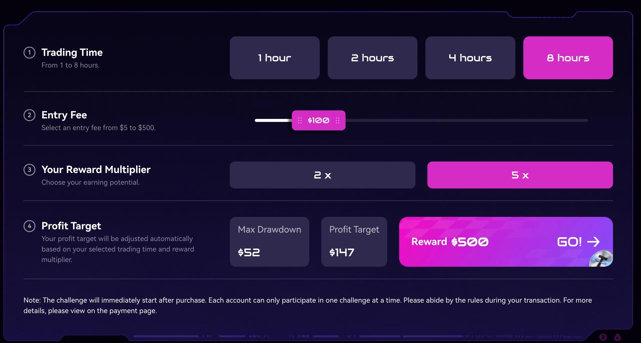 如上图所示,当我选择 8 小时挑战周期、100 美元入场费用、5 倍奖励之后,Edge Hour 自动给出了 147 美元的盈利目标和 52 美元的回撤限制。这意味着我若挑战成功,便可获取 500 美元的奖励,失败了则只会亏掉 100 美元的入场费用。