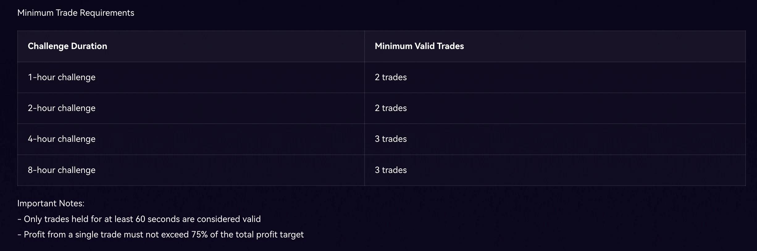 需要注意的是,为了尽量剔除投机用户以及单纯的“碰运气”选手,Edge Hour 会要求用户单笔开仓至少持续 60 秒,且不同挑战时长的用户还会有不同的最低交易笔数限制(如下图所示),同时要求单笔交易的盈利不得超过总盈利目标的 75%。