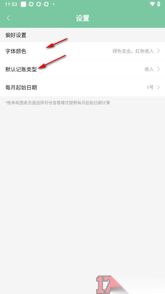 5.除此页面上还支持更改支出和收入的字体颜色,以及可以将默认记账类型设置为收入或者是支出等,如图所示。