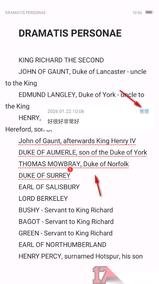 2.在打开的阅读页面上即可查看到显示出来的虚线内容,将其点击一下即可弹出一个管理图标,点击【管理】按钮即可进入。