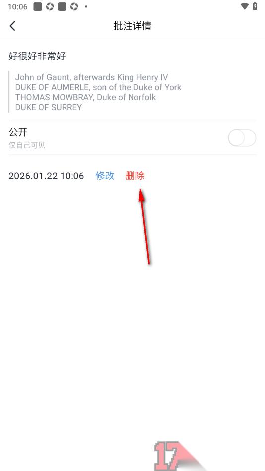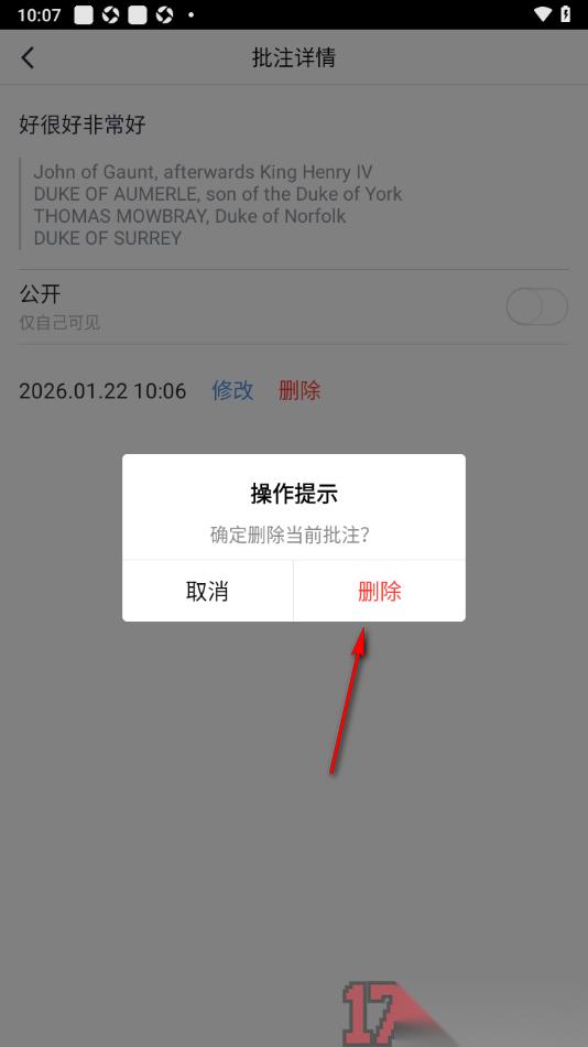 4.在弹出的窗口中将【删除】按钮点击一下即可将当前批注删除操作,之后我们返回到刚刚的阅读页面中。