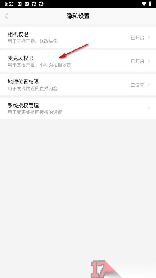 4.在当前打开的页面上即可查看到四种选项,在这里我们直接点击【麦克风权限】进入到系统设置页面中。
