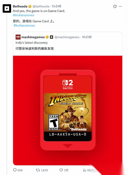 开发商 MachineGames 今日通过社交媒体公开展示了《夺宝奇兵:古老之圈》的 Switch 2 版实体卡带图片。令人意外的是,这款容量巨大的新作并没有采用目前市面上流行的“钥匙卡”(即卡带内仅含几MB数据,其余仍需联网下载),而是采用了能够容纳完整游戏内容的真实大容量卡带。