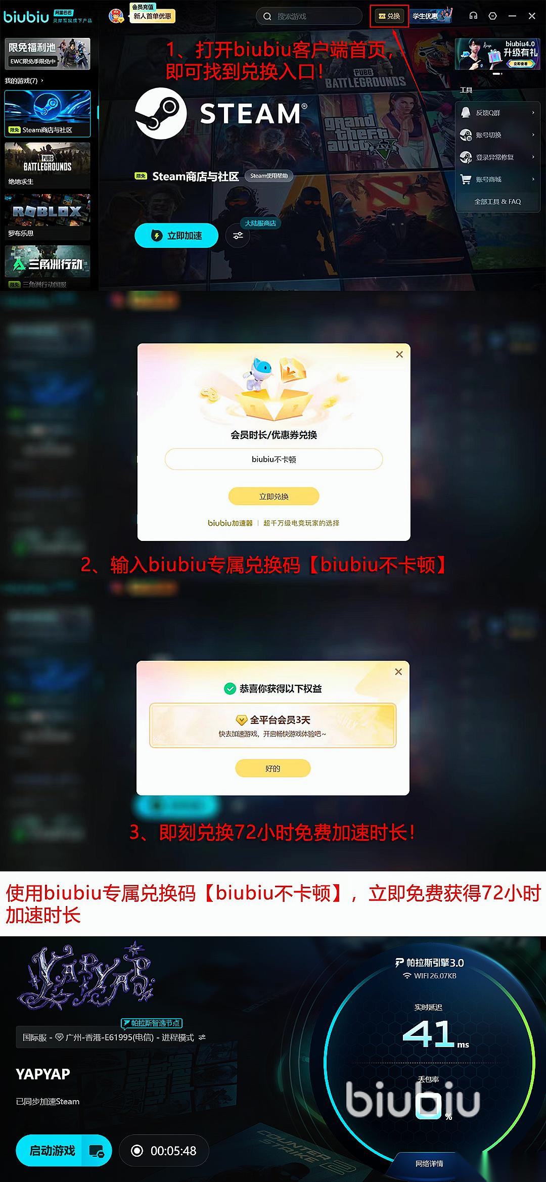 同时新用户完成注册可直接领取24小时全场游戏免费加速权益,新老用户输入兑换码【biubiu不卡顿】就能额外再领3天免费加速时长,新用户将两项福利叠加后,还能累计获得96小时的免费加速权益。
