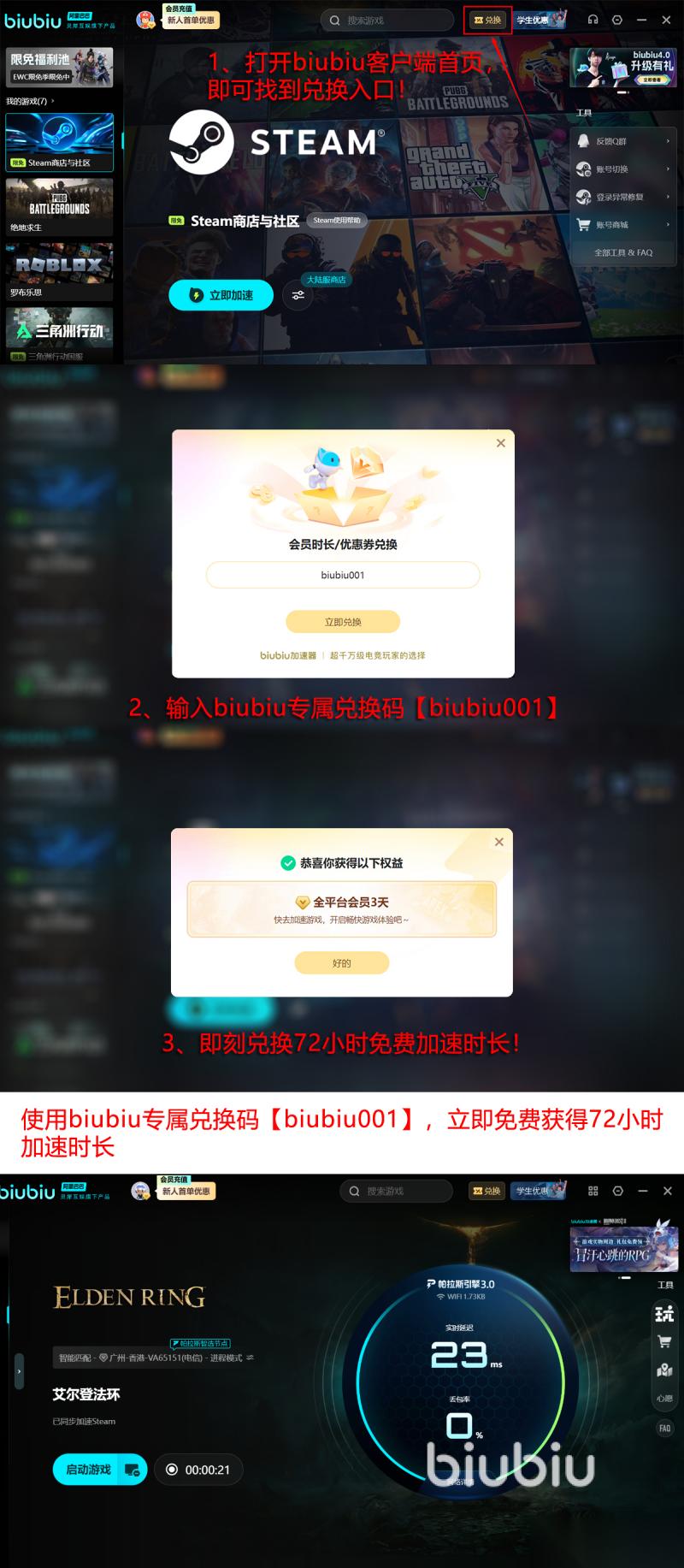 目前有较为丰富的福利,让所有玩家都有免费试用机会,比如使用兑换口令【biubiu001】就能成功获得72小时免费加速时长,新用户可额外领取24小时免费福利,只要官方监测到你是新用户,总计96小时,便会直接发放,并不需要复杂的设定,或者是复杂的领取流程。