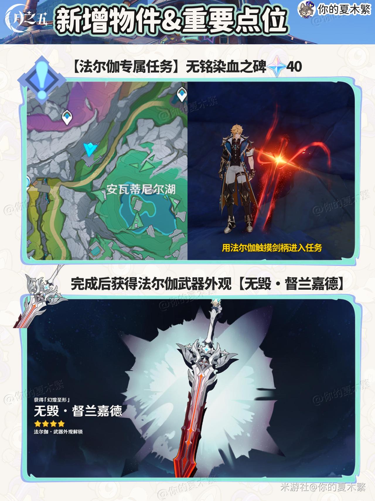原神新增物品点位合集,下文为大家带来玩家“你的夏木繁”分享的【月之五】新增的物品收集,包含:新增食谱×1,新增法尔伽专武武器外观,新增法尔伽魔女课业,新增传说任务,新增挪德卡莱尘歌壶,新增乐器。