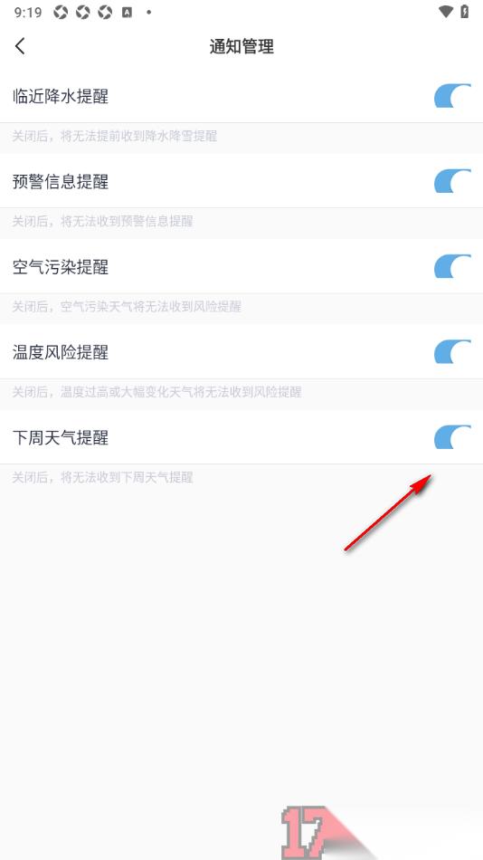 5.然后就进入到设置通知提醒的页面中,找到【下周天气提醒】功能,将该功能点击开启就好了,如图所示。