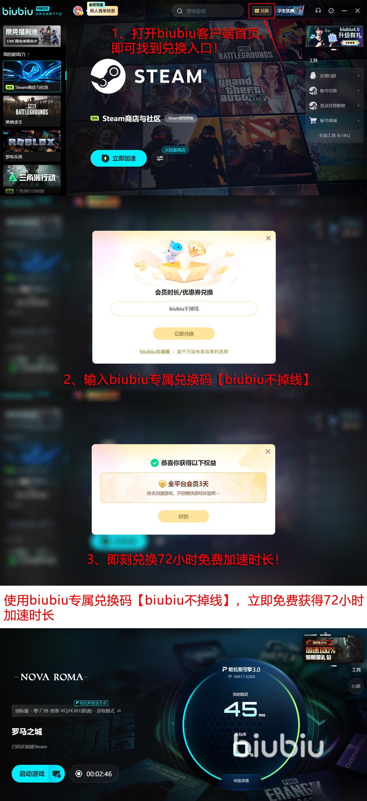 在福利这块儿也是真的良心,新注册的伙伴就送24小时权益,再输【biubiu不掉线】还能多拿3天,俩加起来一共96小时的免费提速时长。