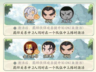 他与共工,三太子,金灵圣母,张三丰有着特殊的羁绊关系(人际关系比较强大),和共工,三太子其中一人同时上阵时可以激活羁绊之力:伙伴攻击提升10%;和金灵圣母,张三丰其中一人同时上阵时可激活羁绊之力:伙伴攻击提升10%。