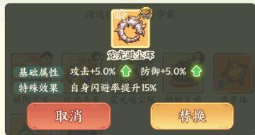 霓光避尘环:基础属性:攻击和防御增加5%;特殊效果:自身闪避率提升15%。